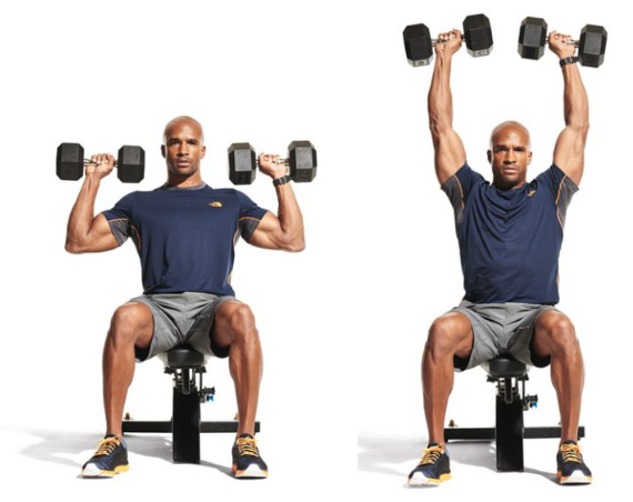 등받이가 있는 벤치에 앉거나, 덤벨을 어깨 높이에 위치시킨 후 손바닥은 정면 또는 약간 바깥쪽으로 향하게 합니다. 만세 자세로 들어 올리고 그 상태로 내리면 됩니다.