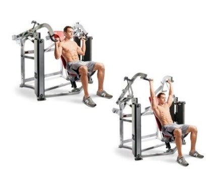 어깨 ㅡ 숄더 프레스 머신( 숄더 프레스 머신은 어깨 전면과 측면 삼각근을 집중적으로 자극하며, 상체의 중심 근육인 가슴(대흉근)과 삼두근까지 서브로 함께 단련할 수 있는 복합 관절 운동 기구입니다. 이 기구는 프리웨이트(덤벨, 바벨)보다 자세가 고정되어 있어 초보자가 운동을 시작하기에 매우 안전한 장점이 있습니다.