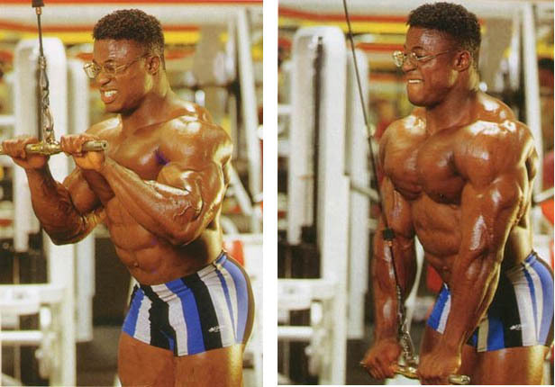 케이블푸쉬다운은 이름 그대로 케이블 머신을 이용해 팔을 아래로 밀어내는 동작입니다. 이때 주로 자극되는 근육은 팔의 뒷부분인 상완삼두근 입니다. 삼두근은 팔의 약 2/3를 차지하는 큰 근육으로, 이 부위의 발달은 팔의 전체적인 두께와 형태를 좌우합니다.