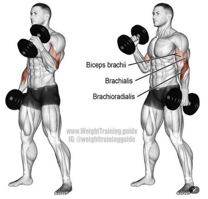 해머컬은 일반적인 덤벨 컬과 달리 **뉴트럴 그립(손바닥이 서로 마주보는 자세)**으로 덤벨을 쥐고 팔꿈치를 굽혀 이두를 자극하는 프리웨이트 운동입니다. 이때 주 자극 부위는 **상완근**과 **상완요골근( 전완근의 일종)**이며, 보조적으로 상완이두근에도 자극이 들어갑니다.