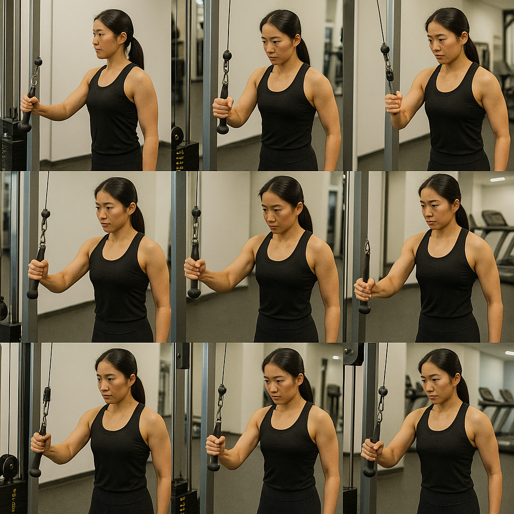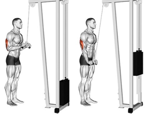 로프 푸쉬다운은 케이블 머신의 상단에 로프 핸들을 연결한 후, 팔꿈치를 고정하고 아래로 밀어내는 방식의 삼두 운동입니다. 이때 주 자극 부위는 삼두근의 외측두, 내측두, 긴두 전반이며, 특히 운동 후반부 로프를 벌리며 마무리할 때 외측과 긴두에 깊은 수축 자극을 전달할 수 있습니다.